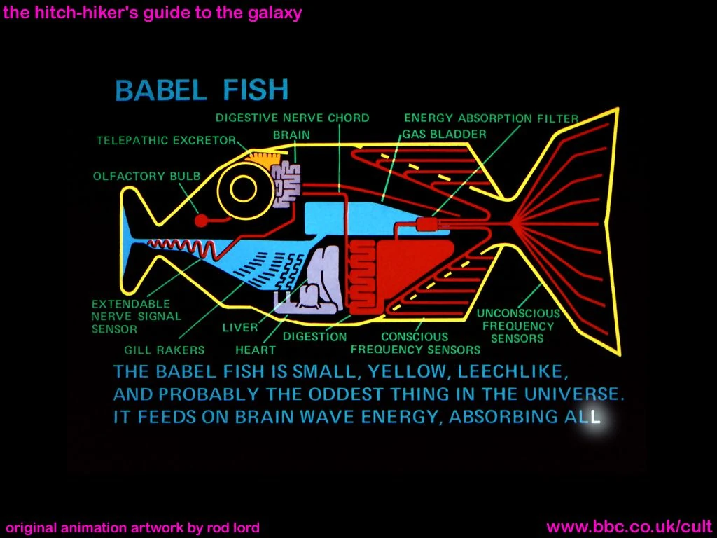 The Babel fish is small yellow and leech-like, and probably the oddest thing in the Universe. It feeds on brainwave energy received not from its own carrier, but from those around it. It absorbs all unconscious mental frequencies from this brainwave energy to nourish itself with. It then excretes into the mind of its carrier a telepathic matrix formed by combining the unconscious thought frequencies with nerve signals picked up from the speech centres of the brain which has supplied them.